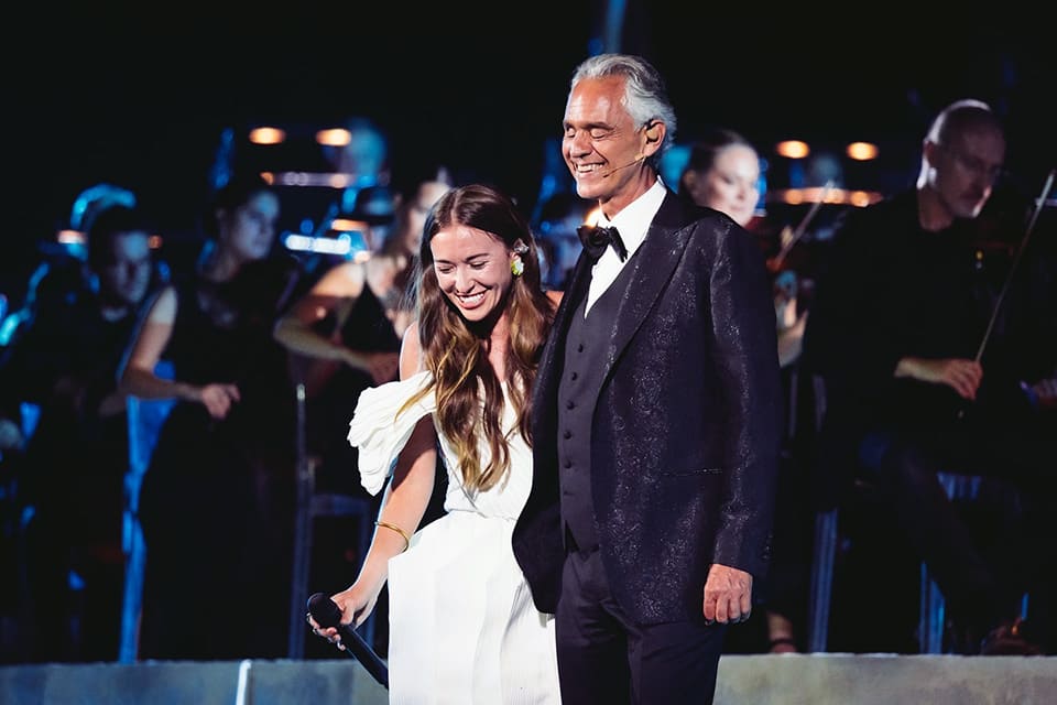 Bajo el cielo nocturno de la Toscana, la soprano y el pianista deleitaron al público del Teatro del Silenzio en los conciertos organizados para celebrar el 30 aniversario de Andrea Bocelli sobre los escenarios.