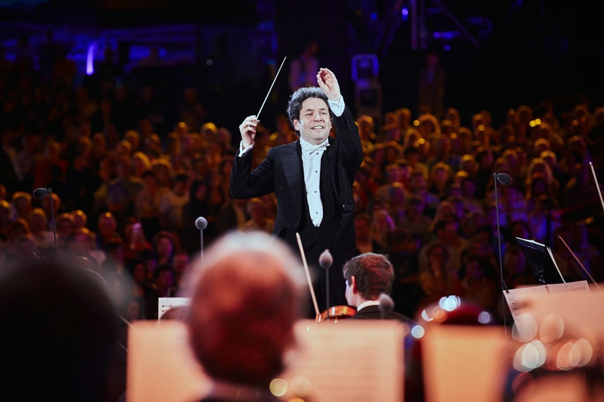 Dudamel ha sido director invitado habitual de la Filarmónica de Viena, también durante sus giras. Tocó con la orquesta por primera vez en 2007, regresó en 2010, y encantó a una amplia audiencia en el Concierto de Noche de Verano 2012 en Viena. Dos años más tarde, abrió la temporada 2014 en el Theater an der Wien y en la tradicional Semana Filarmónica de Viena en Japón ese mismo año. En 2017, fue el director más joven en dirigir el famoso Concierto del Día de Año Nuevo de la Filarmónica de Viena.