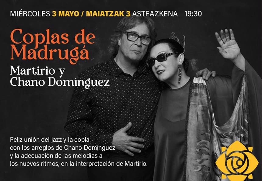 En la tercera cita, ya en el mes de mayo, celebraremos las bodas de plata de la legendaria fusión del jazz y la copla de Martirio y Chano Domínguez concebida en Coplas de Madrugá.