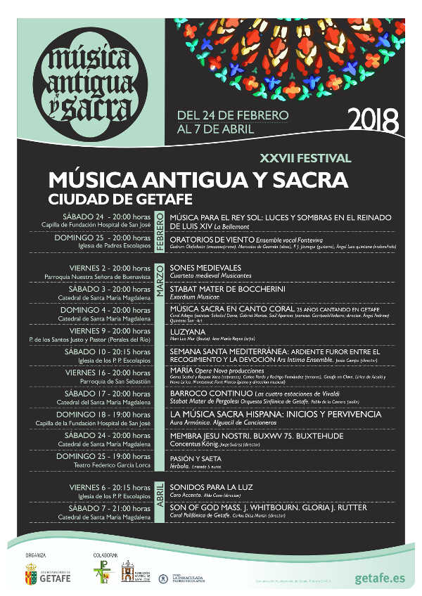 Pero el ‘Ciudad de Getafe’ aglutina composiciones muy variadas. Así, podremos disfrutar de obras como las 4 estaciones de Vivaldi y el Stabat Mater de Pergolesi interpretado por la Orquesta Sinfónica de Getafe así como de la Coral Adagio, el dúo Luzyana, Ópera Nova, Alguacil de cancioneros, el Ensemble Ars Íntima y Concentus König quecomplementan una programación muy variada con grandes obras de este repertorio.