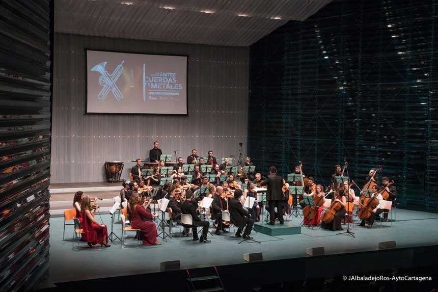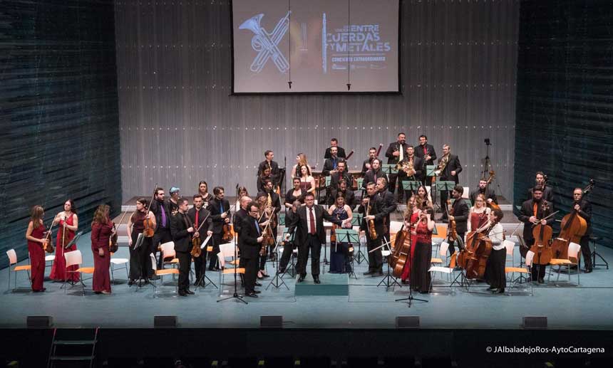 El concierto recuperó la presencia de antiguos premiados del concurso ‘Entre Cuerdas y Metales’, que se han consolidado y han cosechado numerosos éxitos en sus carreras musicales. El espectáculo contó con la actuación de los hermanos cartageneros Emilio y Álvaro Yepes como solistas. Ambos son contrabajistas formados en el Conservatorio de Cartagena y que hoy día cuentan con una importante trayectoria musical en Europa.