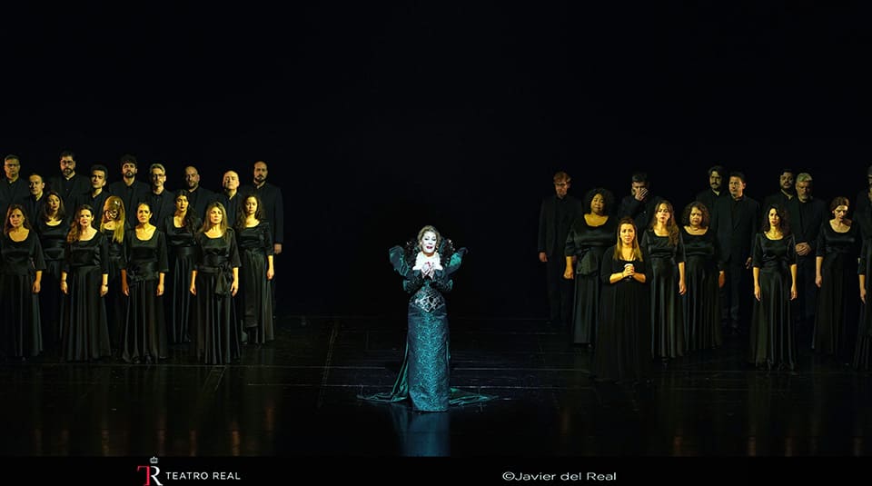 Saludos finales: José Luis Basso (director del Coro), Fabián Lara (Lord Cecil), Riccardo Firzza (director musical), Sondra Radvanovsky (Elisabetta), Rafael Villabolos (propuesta escénica) y Coro Titular del Teatro Real