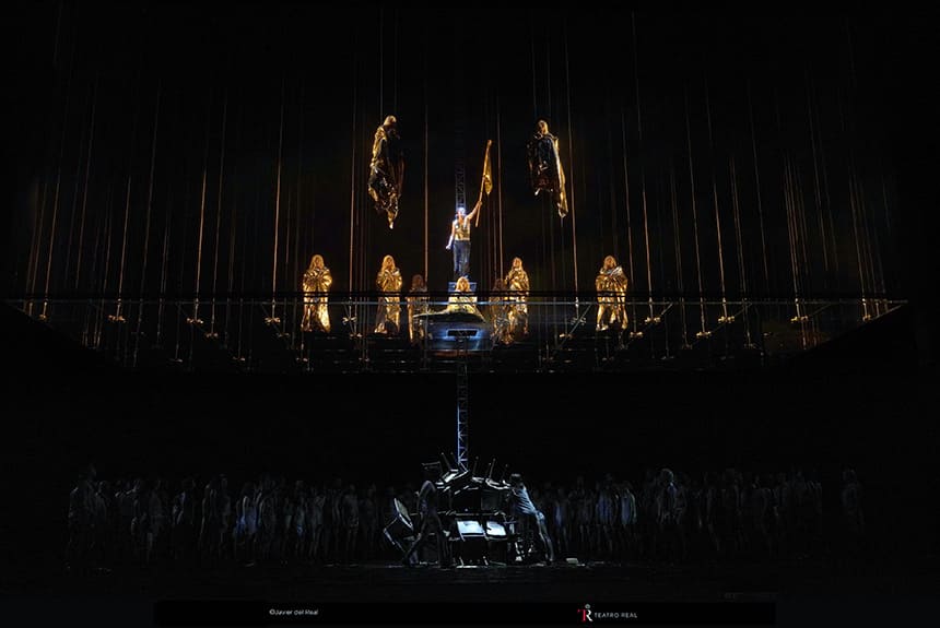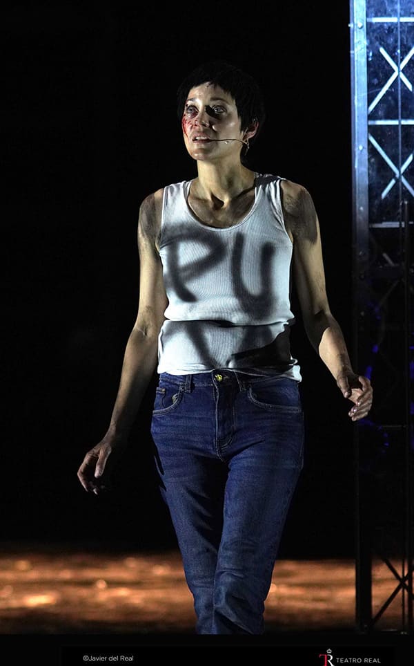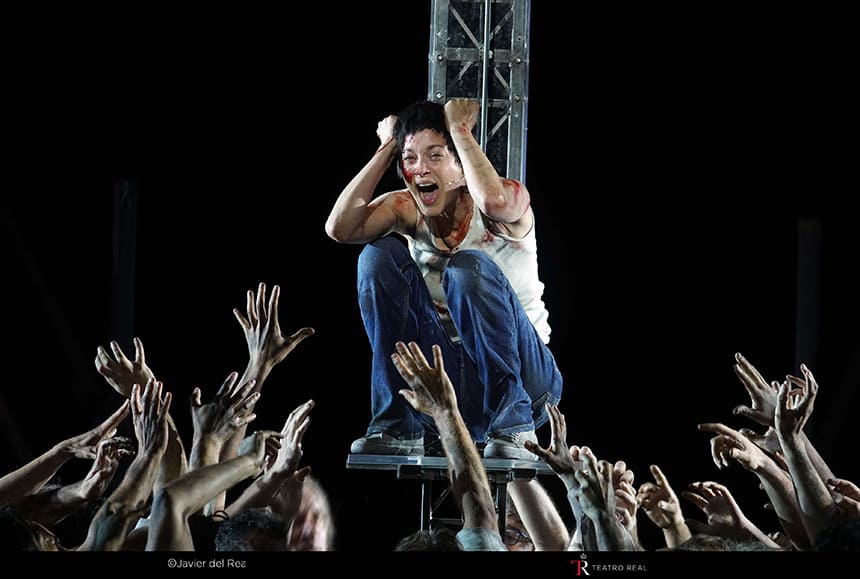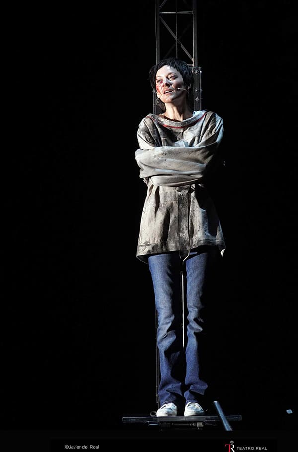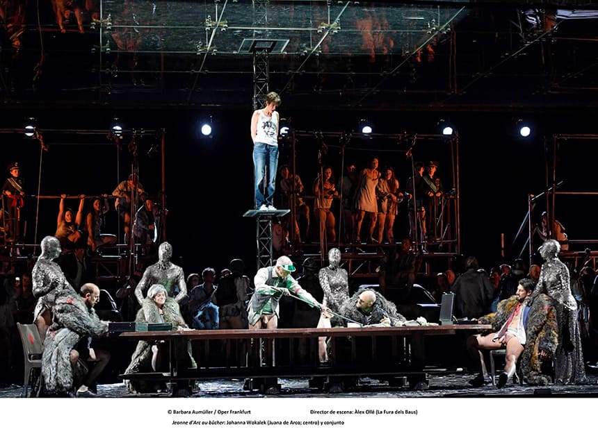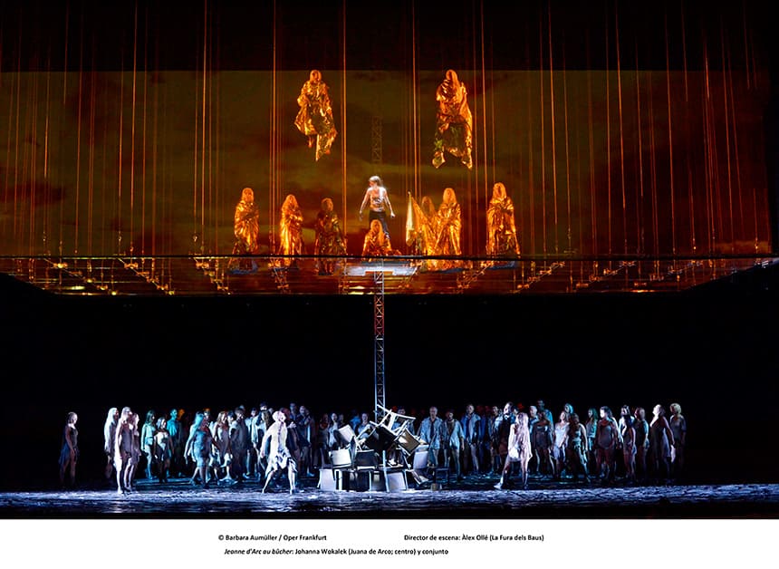 Àlex Ollé concibe la producción como una distopía, con un mundo arrasado por las mismas hordas deshumanizadas que han devastado Europa en el siglo XV de Juana de Arco, en el siglo XX de Claudel y Honegger y en siglo XXI, más allá de nosotros: un universo de bestias manipuladoras y de chusmas gregarias del que solo la muerte, la espiritualidad y la fe nos pueden liberar.