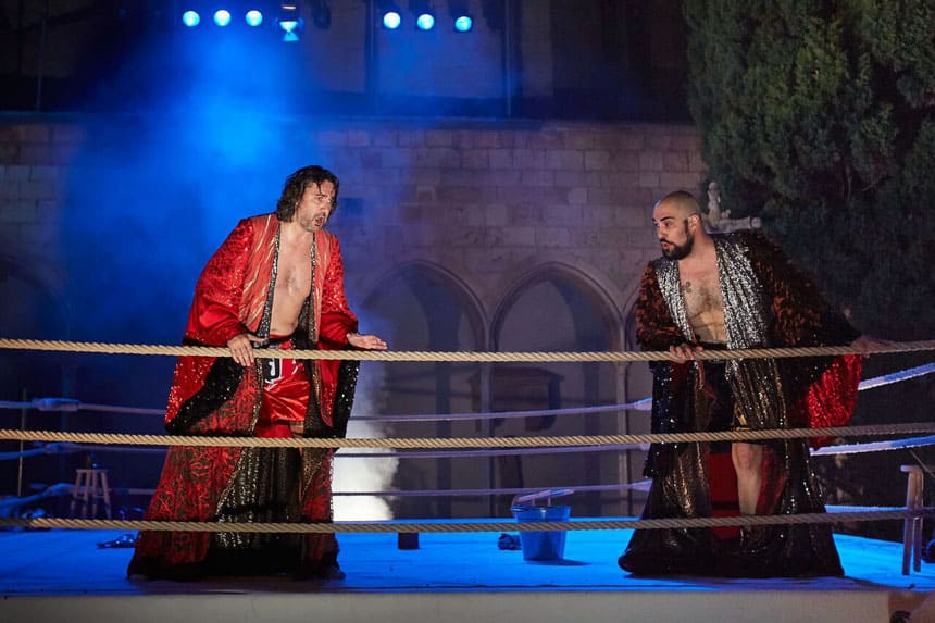 El director musical Fausto Nardi y el director de escena Joan Anton Rechi, nos proponen un combate de boxeo en el que personajes enmascarados como deportistas de lucha libre, libran el combate de la vida, cantado bellísimos madrigales que reflexionan sobre la naturaleza del amor, de la perdida y de las relaciones entendidas como luchas.