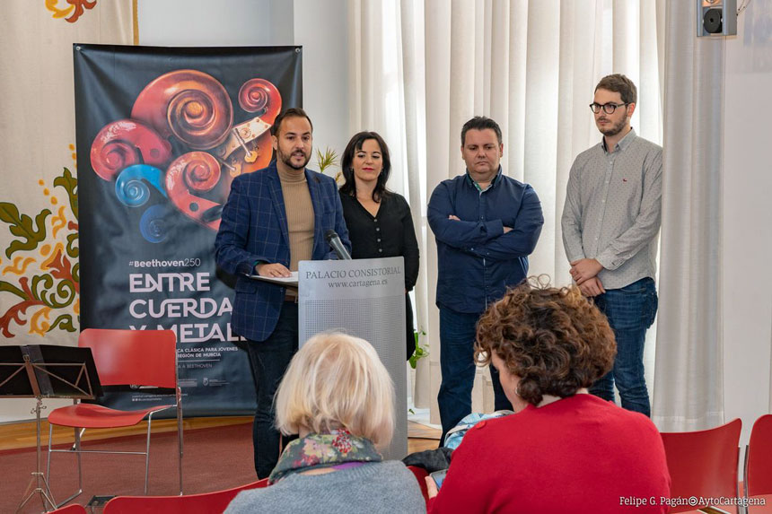 El concurso de Música Clásica Entre Cuerdas y Metales para jóvenes intérpretes de la Región de Murcia ha sido presentado en el Palacio Consistorial este martes, 12 de noviembre, por el concejal del Área de Juventud, David Martínez, acompañado de la directora del Conservatorio de Música de Cartagena, María José Castaño, el director de la Joven Orquesta Sinfónica de Cartagena, Álvaro Pintado, y el director de la Orquesta Sinfónica de Cartagena, Leonardo Martínez.