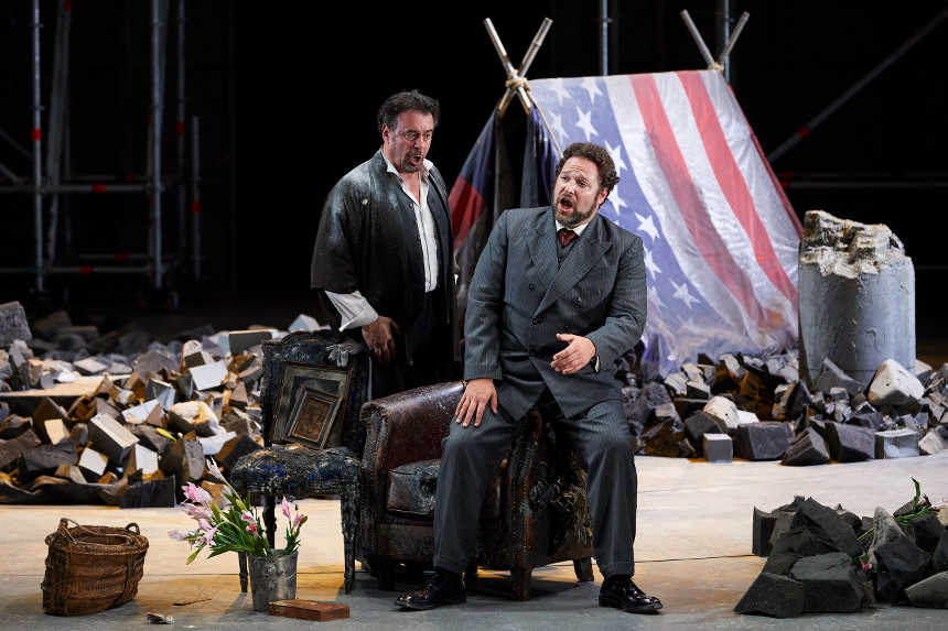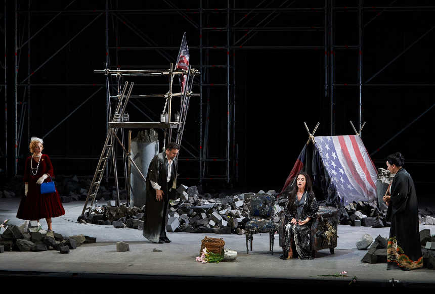 El escenógrafo Alfons Flores presenta grandes columnas y una bandera norteamericana de cinco metros siendo los aspectos más visuales del escenario y la escenografía del primer acto. Un acto que acaba con el lanzamiento de la bomba y que da paso a un segundo y tercer acto en una ciudad totalmente devastada.