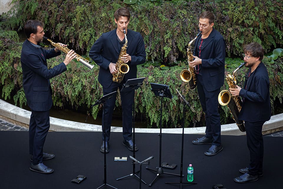 A las cinco y media de la tarde, el cuarteto de saxofones Kebyart ha dado el pistoletazo de salida sorprendiendo a los invitados y a los transeúntes de la plaza con una fanfarria desde uno de los balcones del Palazzo di Spagna, que ha servido de prólogo festivo a la velada.