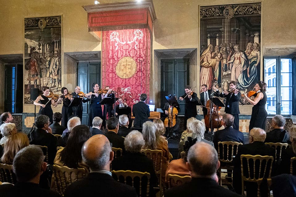 A continuación, el Salón Palafrenero del Palazzo di Spagna ha acogido el concierto Corelliana, a cargo de la orquesta barroca catalana Vespres d’Arnadí, bajo la dirección de Dani Espasa y con Farran Sylvan James como concertino.