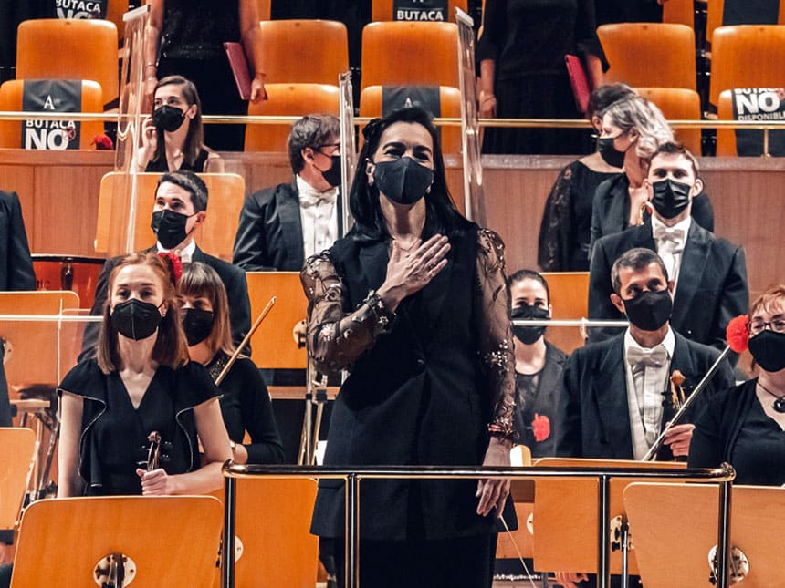 Con la firme creencia de que “la música es necesaria e imprescindible en la sociedad”, Silvia Sanz Torre ha hecho frente a todas las barreras que ha supuesto el COVID-19. Durante la temporada 2020-2021 continúa con sus conciertos en el Auditorio Nacional a pesar de la incertidumbre y las dificultades surgidas de la situación de pandemia, entre ellas, la reducción de aforos y de número de intérpretes.