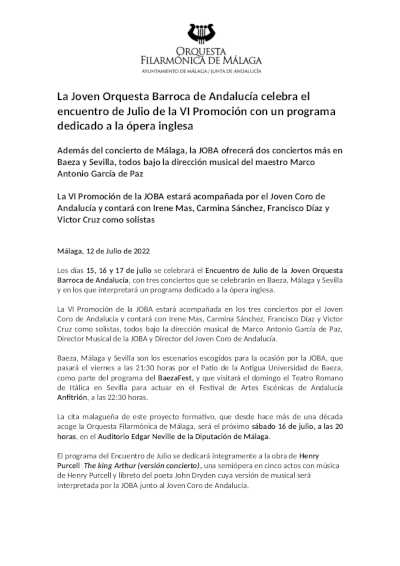 Los días 15, 16 y 17 de julio se celebrará el Encuentro de julio de la Joven Orquesta Barroca de Andalucía, con tres conciertos que se celebrarán en Baeza, Málaga y Sevilla y en los que interpretará un programa dedicado a la ópera inglesa.