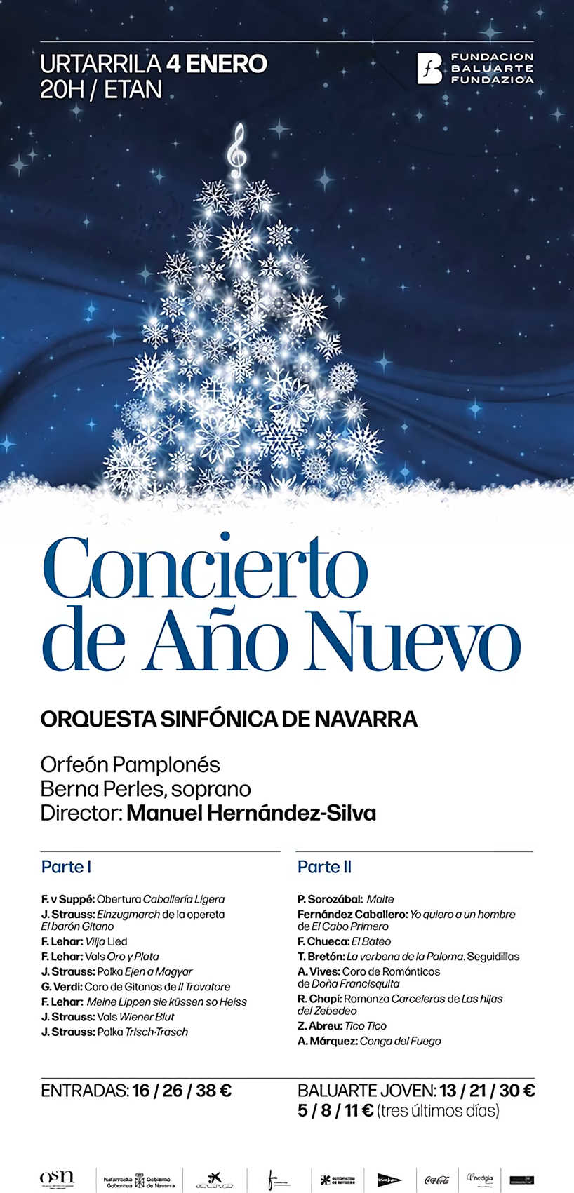 El Coro juvenil del Orfeón Pamplonés también intervendrá en esta cita especial de bienvenida al 2019, en la que se interpretarán obras de compositores como F. v Suppé, J. Strauss, F. Lehar, G. Verdi. P. Sorozábal, Fernández Caballero, F. Chueca, T. Bretón. A. Vives, R. Chapí, Z. Abreu o A. Márquez.