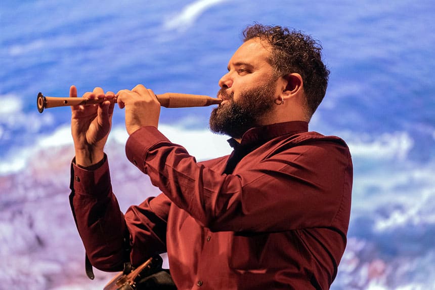 La Real Filharmonía de Galicia contará con la colaboración del multiinstrumentista Abraham Cupeiro, que interpretará varias piezas suyas. El músico, natural de Sarria, desplegará sobre el escenario diversos instrumentos de viento antiguos, olvidados en el tiempo, de diferentes épocas y lugares, algunos de ellos de hace más de 2.000 años, que él mismo recuperó y reconstruyó para crear nuevas sonoridades e imbricarlos en músicas ajenas a ellos.