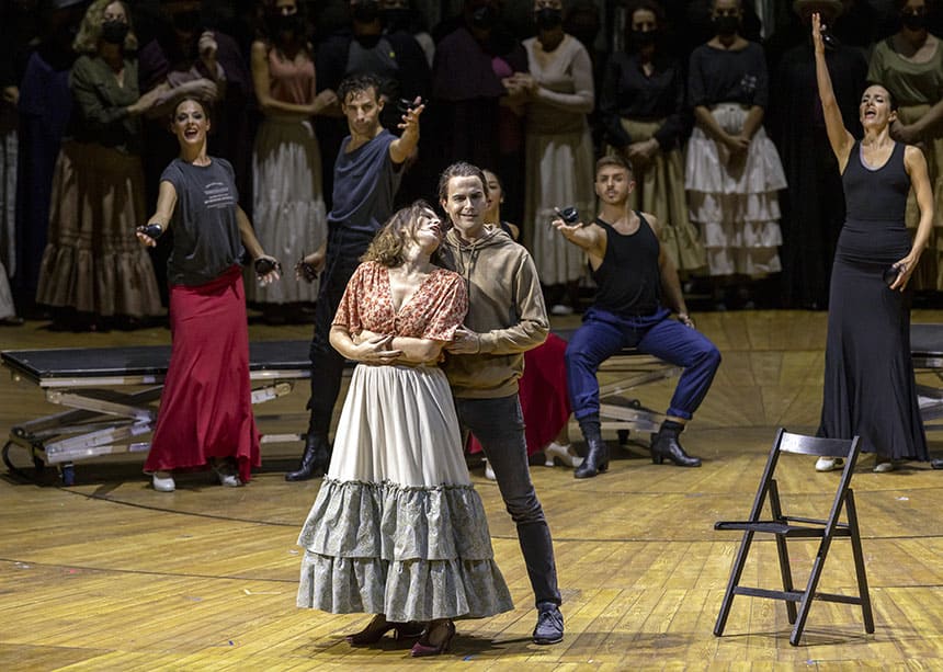 El reconocido director de escena rinde su particular homenaje a la obra maestra del género con este montaje, coproducción entre el Teatro de la Zarzuela, el Liceu y la Ópera de Lausanne, con escenografía y vestuario de Alejandro Andújar, iluminación de Pascal Mérat, coreografía de Nuria Castejón y diseño audiovisual de Celeste Carrasco.