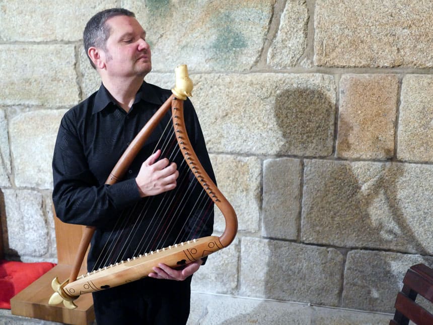 • Arpa medieval por Manuel Vilas Rodríguez, especialista en arpas de los siglos XI al XVIII. Sus inquietudes profesionales circulan en torno a la investigación musical sobre las fuentes originales con la finalidad de aunar excelencia artística con rigor científico.