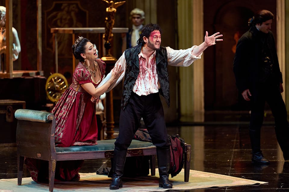La escenografía actúa como una caja de resonancia, que proyecta al espectador en un espacio opulento, dominado visualmente por los símbolos de la Roma papal de 1800, desde la vista en perspectiva de la cúpula de Sant’Andrea della Valle que abre el primer acto hasta los imponentes espacios del Palazzo Farnese y la terraza del Castel Sant’Angelo.