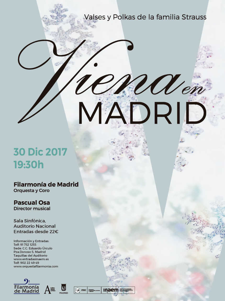 El próximo 30 de diciembre la Orquesta y Coro Filarmonía de Madrid se adelantan al tradicional concierto de año nuevo de la Sala Dorada de la Musikverein de Viena con el concierto Viena en Madrid en la sala sinfónica del Auditorio Nacional de Música de Madrid.