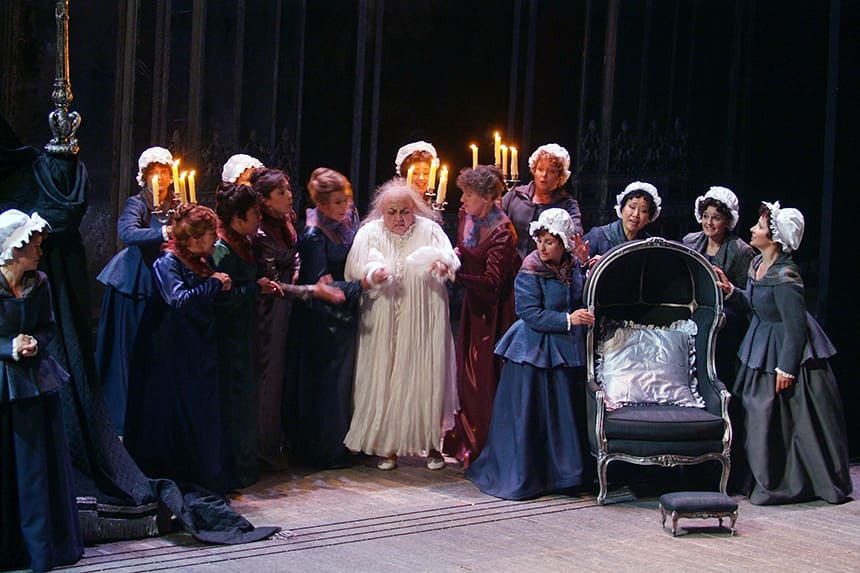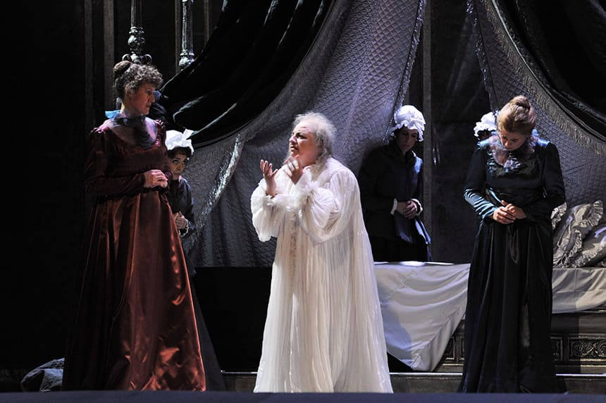 La cámara de la condesa se muestra tupida, polvorienta y oscura, como si fuera el refugio de una bruja. Hermann, que en su popular escena de la tormenta ha empezado a obsesionarse con el secreto de la anciana —esas tres cartas que desbloquean el secreto para ganar en el juego—, arrastra ahora consigo el mal fario, a su alrededor todo es negritud e inquietud. En el tercer acto, la producción recuerda a las viejas películas de terror y a los grabados de los libros clásicos de literatura fantástica: el amor ha sido vencido por la irracionalidad, la luz ha sido arrinconada por la oscuridad que nubla la mente de Hermann.
